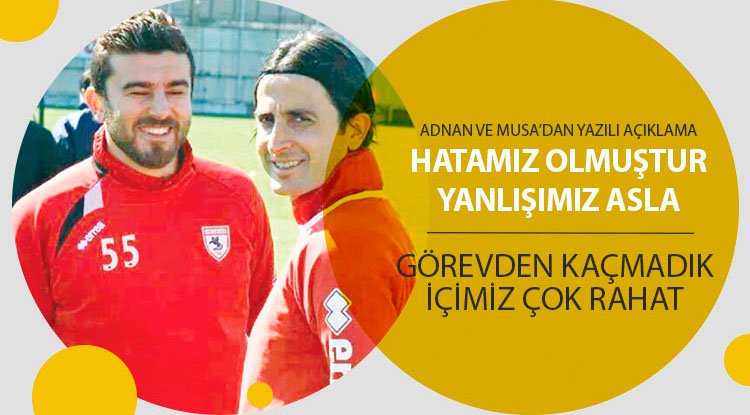 Görev yaptığımız süre içerisinde işimizi ailemizin önünde tutarak çalışıp elimizden gelen herşeyi yapmanın verdiği gönül rahatlığı ile ayrılıyoruz. Çalışırken hatalarımız olmuştur ancak yanlışımız olmamıştır. İstemeden veya fark etmeden Samsunspor'umuza zarar verdiysek tüm şehrimizden, taraftarımızdan ve Samsunspor'lulardan özür dileriz. Görev yaptığımız süre zarfında aile içinde olan aile içinde kalır düşüncesiyle kamuoyunda olumsuz olan her şeyin üstümüze kalmasına rağmen bir gün olsun çıkıp açıklama yapmadık veya bunun bizimle alakası yok diyerek dışarıya bilgi sızdırmadık.