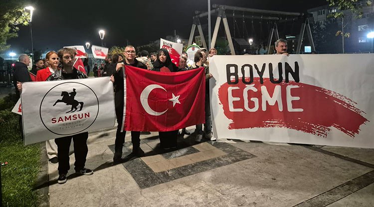 "Boyun Eğme" yazılı pankartların ve Türk bayraklarının taşındığı eylemde, "Kahrolsun saltanat, yaşasın Cumhuriyet", "Bağımsız Türkiye" sloganları atıldı.