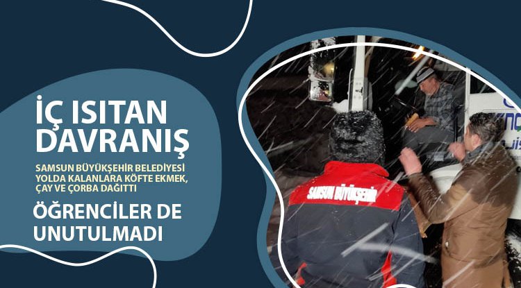 Samsun-Ankara karayolunda kar yolları kapatınca, soğukta bekleyenlerin içini Büyükşehir Belediyesi ısıttı. Belediye ekiplerince yoğun kar yağışı ve tipi yüzünden Ankara karayolunda mahsur kalanlara köfte ekmek, sıcak çorba ve çay ikramı yapıldı.