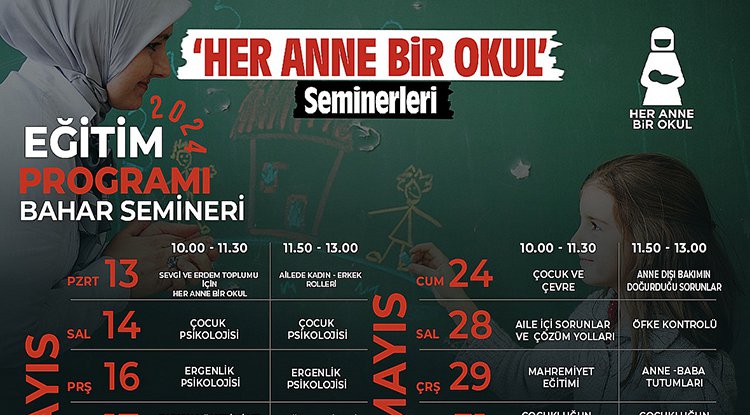‘Her Anne Bir Okul’ seminer programı 13 Mayıs 2024 ve 7 Haziran 2024 tarihleri arasında Sezai Karakoç Canik Kültür Merkezi’nde gerçekleştirilecek. Eğitimci-Yazar Necla Koytak ve Eğitimci-Yazar Seyhan Büyükcoşkun’un katılımlarıyla annelere özel 21 konu başlığında seminerin düzenleneceği ‘Her Anne Bir Okul’ seminer program başvuruları, 12 Mayıs 2024 tarihine kadar devam edecek. Başvurular 0530 447 13 52 iletişim numarası üzerinden gerçekleştirilecek. Seminer programı hakkında detaylı bilgiye ise iletişim numarası üzerinden ulaşılabilecek.