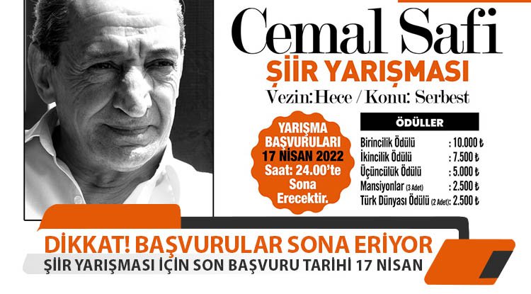 Türk edebiyatına büyük katkılar sağlayan ve bestelenen 150'den fazla şiiri ile kalplerde taht kuran şair Cemal Safi adına İlkadım Belediyesi'nce düzenlenen Şiir Yarışması'na son başvuru 17 Nisan 2022 Pazar günü sona eriyor. Yarışmalarda dereceye girenler, her yıl olduğu gibi para ödülünün ve çeşitli hediyelerin sahibi olacaklar.
