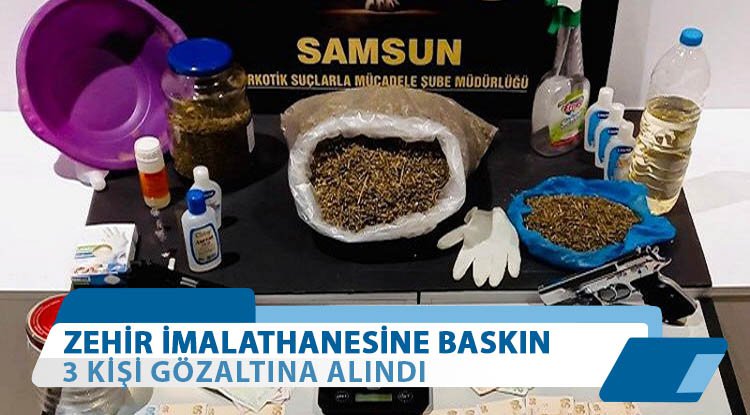 Samsun'da uyuşturucu satıcılarına yönelik çalışmalarını sıkı bir şekilde sürdüren Narkotik Suçlarla Mücadele Şube Müdürlüğü ekipleri, İlkadım İlçesi'nde bulunan Reşadiye Mahallesi'nde bir evde uyuşturucu madde imalatı ile ilgili istihbarat alarak harekete geçti. Kısa sürede eve operasyon düzenleyen narkotik polisi 3 kişiyi gözaltına alırken, ev ve üst aramalarında ise 1 kilo 247 gram sentetik kannabinoid maddesi, 838,22 gram sentetik kannabinoid maddesi yapımında kullanılan sıvı hammadde, uyuşturucu madde seyreltmek için kullanılan 6 şişe halinde toplam 500 mililitre aseton maddesi, 1 adet hassas terazi, uyuşturucu madde imalatında kullanılan plastik eldiven, sprey şişesi, kova ve çok sayıda materyaller, 17 kapsül sentetik ecza, 1 adet ecstasy hap, 1 adet esrarlı sigara, 2 adet ampül içerisinde 10 mililitre uyuşturucu madde seyreltmek için kullanılan çözelti, 2 adet değişik çaplarda ruhsatsız tabanca, 1 adet kurusıkı tabanca, 62 adet değişik çaplarda tabanca fişeği, 45 adet kurusıkı tabanca fişeği, uyuşturucu madde satışından elde edildiği değerlendirilen 6 bin 680 TL para ele geçirildi.