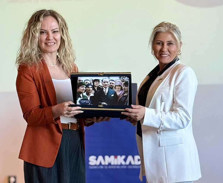 Konuşmaların ardından GİFED Başkanı Oya Eroğlu, SAMİKAD Başkanı Şehnaz Dereli’ye GİFED rozetini takarak katılımı resmileştirdi. Tören karşılıklı hediye takdimi sona erdi.