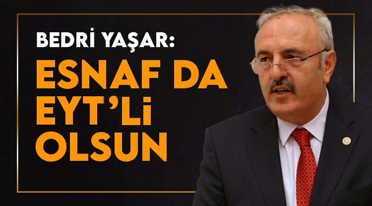 İYİ Parti Yerel Yönetimler Başkan Yardımcısı Samsun Milletvekili Bedri Yaşar, esnaf kesiminin de EYT kapsamına alınması gerektiğini kaydederek, SSK’lı olarak çalışanlar 7200 iş günü üzerinden emeklik hakkı elde ederken, esnaf kesiminin 7 gün 24 saat gece- gündüz çalışmalarına rağmen 9000 iş gününde ancak emekli olabildikleri ifade etti.
