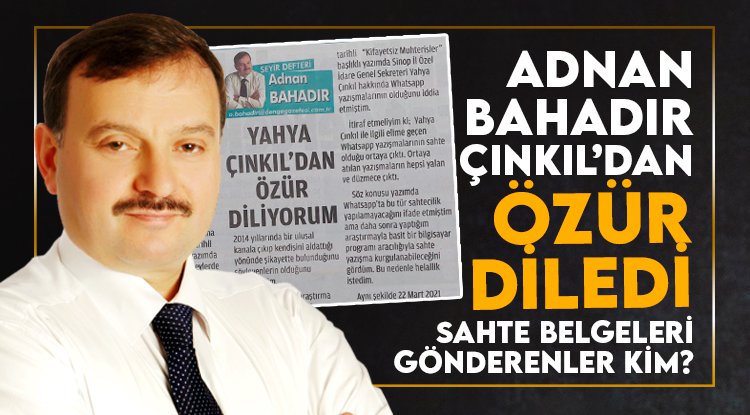 Yazısında özür dilemenin de bir erdem olduğunu belirten Adnan Bahadır, "Bu sefer sanırım ben de bir hata yaptım. Değerli bir bürokratın ve eşinin hakkına girdim. 02 Eylül 2022 tarihli "Kınıyorum" başlıklı yazımda Samsun'da önemli görevlerde ve hizmetlerde bulunmuş olan Sinop İl Özel İdaresi Genel Sekreteri Yahya Çınkıl ve eşi hakkında isim vermeden iddialarda bulunmuştum. Ancak ne var ki bu iddiaların tamamı asılsız ve mesnetsiz olduğu ortaya çıktı. Bana gelen bilgiler doğrultusunda yazdığım yazımda Genel Sekreter Yahya Çınkıl'ın değerli eşinin 2013-2014 yıllarında bir ulusal kanala çıkıp kendisini aldattığı yönünde şikayette bulunduğunu söyleyenlerin olduğunu belirtmiştim. Oysa ki ciddi bir araştırma neticesinde gördüm ki bu iddiaların hepsi yalanmış. Böyle bir televizyon yayınının ve böyle bir olayın yaşanmamış olduğunu öğrendim. Yahya Çınkıl'dan ve özellikle değerli eşi hanımefendiden helallik istiyorum" dedi.