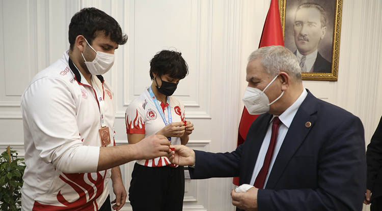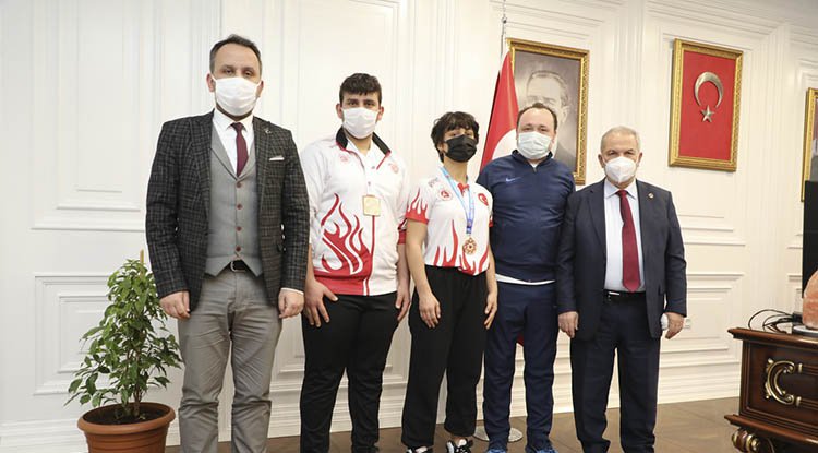 Antrenör Fatih Karagül ve Spor İşleri Müdürü Hakan Karaman’la birlikte başarılarını altın madalya ile taçlandıran sporcular Devrim Aydın, Atanur Yayla İlkadım Belediye Başkanı Necattin Demirtaş’ı makamında ziyaret etti. Sporcularla sohbet eden Başkan Demirtaş, Genç Erkekler 94 Kg Kategorisinde Altın madalya alan Atanur Yayla’ya ve Büyük Bayan 60 Kg K-1 Style Kategorisinde Altın madalya alan Devrim Aydın’ı çeyrek altınla ödüllendirdi.