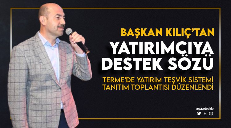 Terme'de gerçekleştirilen Yatırım Teşvik Sistemi tanıtım toplantısında konuşan Terme Belediye Başkanı Ali Kılıç, "İlçemize yatırım yapacak her işadamının önünü açmak için elimden geleni yapıyorum, yapmaya da devam edeceğim. Yeter ki siz yatırım yapmak için uğraşın" dedi.