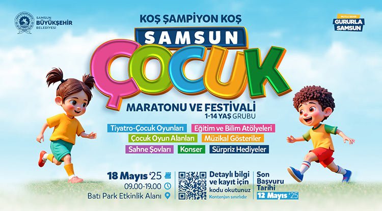 Hem yetişkinlere hem de çocuklara hitap edecek etkinlikler ise Batı Park’ta günün erken saatlerinde start alacak. Samsun Büyükşehir Belediyesi tarafından “Koş Şampiyon Koş” sloganıyla düzenlenen ve saat 09.00’da başlayacak Samsun Çocuk Maratonu ve Festivali ile 1-14 yaş arası çocuklar farklı parkurlarda mücadele edecek. Maratonda 1-3 ve 4-5 yaş çocuklar 200 metre mesafede aile bireyleri ile koşarken, 6-7 ve 8-9 yaş grubu çocuklar 300 metre, 10-11 ve 12-13-14 yaş çocuklar 400 metre mesafede koşmanın heyecanını yaşayacaklar. Maratonda ayrıca farkındalık oluşturmak amacı ile engelli çocuklar için özel parkur da oluşturulacak. Dereceye girenler aldıkları madalya ile “Bu Madalya Senin Anneciğim” diyecekler.