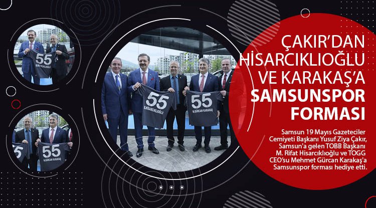 Samsun 19 Mayıs Gazeteciler Cemiyeti Başkanı Yusuf Ziya Çakır, Samsun'a gelen TOBB Başkanı M. Rifat Hisarcıklıoğlu ve TOGG CEO’su Mehmet Gürcan Karakaş'a Samsunspor forması hediye etti.