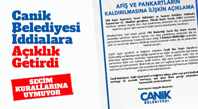 Afiş ve pankartların kaldırılmasına ilişkin Canik Belediyesi tarafından yapılan açıklamada, "298 Sayılı Seçimlerin Temel Hükümleri ve Seçmen Kütükleri Hakkında Kanunu’nun 61. Maddesi gereğince, Yüksek Seçim Kurulu (YSK) tarafından belirlenen yerlerin dışında olan veya yasaklanmış yerlerdeki afiş ve pankartların kaldırılma görevi ilgili mercilerin talebi üzerine belediyelere tanınmıştır. Belediyemizce, ilgili kanun gereği YSK Başkanlığı Canik İlçe Seçim Kurulu tarafından belirlenen yerlerin dışında olan veya yasaklanmış yerlerdeki afiş ve pankartların kaldırılması hususunda karar aldığı, İl Emniyet Müdürlüğü tarafından yetki ve sorumluluk alanımız dâhilinde tarafımıza havale edilen afiş ve pankartları kaldırılmaktadır" denildi.