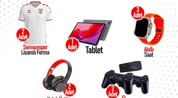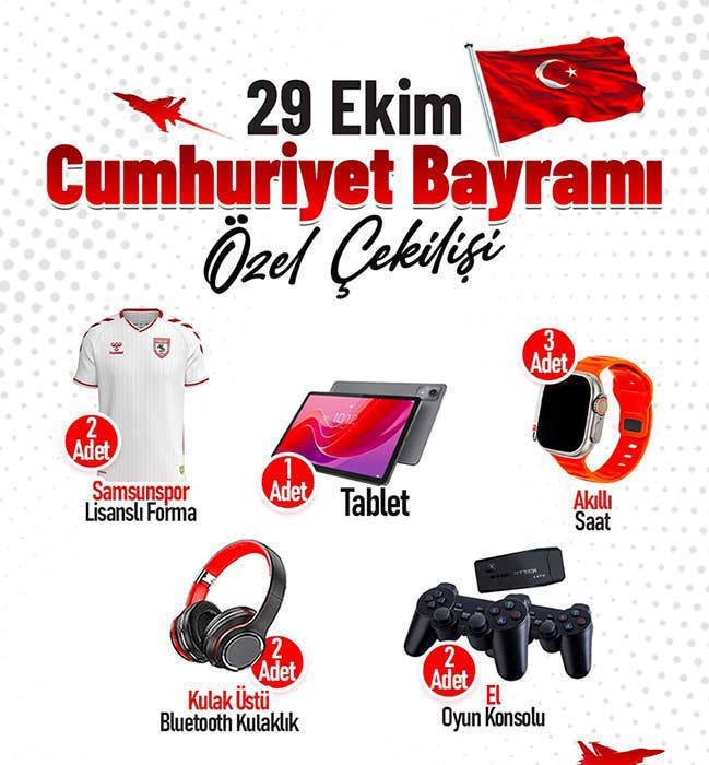Canik Belediye Başkanı İbrahim Sandıkçı ve Canik Belediyesi sosyal medya hesapları üzerinden katılım sağlanabilen çekiliş programının sonuçları 30 Ekim 2025 tarihinde açıklanacak. 1 adet tablet, 2 adet Samsunspor Lisanslı forma, 3 adet akıllı saat, 2 adet kulak üstü bluetooth kulaklık ve 2 adet el oyun konsolu olmak üzere toplam 10 hediyenin sahibini bulacağı çekiliş programına, 29 Ekim 2025 saat 23.59'a kadar başvuru gerçekleştirilebilecek.