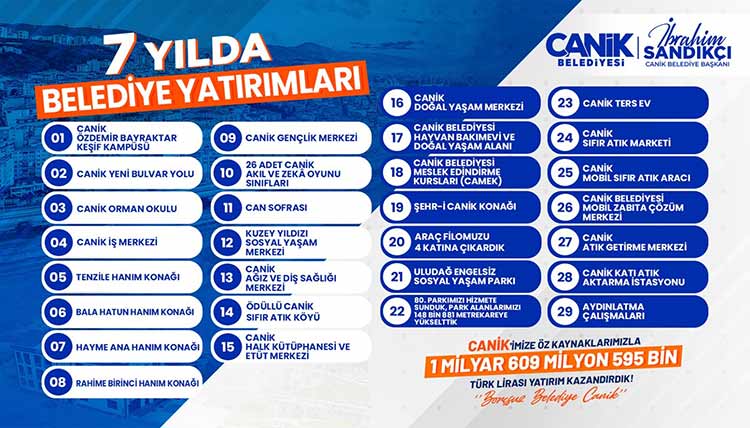 Karadeniz Bölgesi'nin en büyük macera parkı olma özelliğini taşıyan Canik Macera Parkı ve Canik Belediyesi Özel Çocuklar Misafirhanesi gibi yeni projelerin yapım ve tefrişat çalışmalarını yoğun bir şekilde sürdürdüklerine değinen Başkan İbrahim Sandıkçı, "Canik'imizde eser ve hizmet seferberliğimizi sürdürüyoruz. İlçemizin hem bugününe hem de geleceğine değer katan projeleri hizmete sunuyoruz. Büyük bir gayret ve azimle gerçekleştirdiğimiz çalışmalarla ilçemize belediyemiz öz kaynaklarıyla 1 milyar 609 milyon 595 bin Türk lirası değerinde yatırım kazandırdık. Planlı adımlarla yeni projeleri ve yatırımları hemşehrilerimizle buluşturmaya, her alanda daha güçlü bir Canik için çalışmaya, üretmeye ve ilçemize değer katmaya devam ediyoruz" şeklinde konuştu.