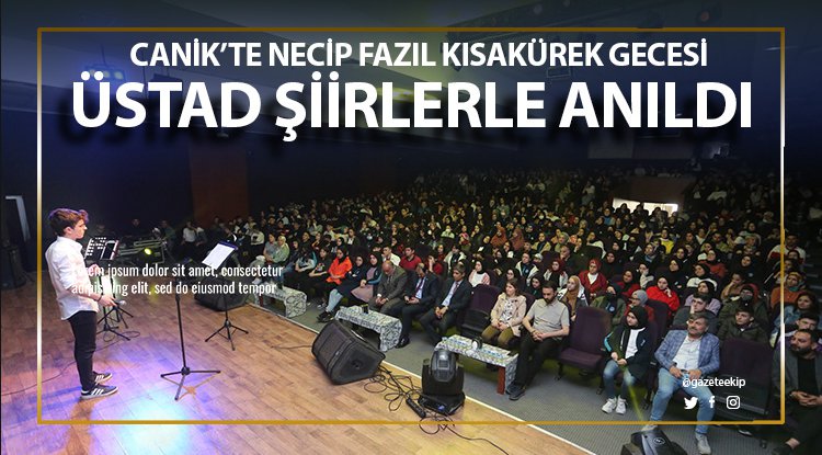 Canik Belediyesi Kültür ve Sosyal İşler Müdürlüğü tarafından Necip Fazıl Kısakürek anısına düzenlenen programda sahne alan Karşıyaka Anadolu Lisesi öğrencilerinden Caner Köse’nin yorumladığı “Kaldırımlar” ve Semanur Aybulut’un yorumladığı “Zindandan Mehmed’e Mektup” şiiri büyük ilgi uyandırdı. Şair ve yazar Yasir Tiryaki’nin yorumladığı şiirlerle coşkulu anların yaşandığı program, Yücel Arzen tarafından bestelenen “Sakarya Türküsü” şiirinin icrasıyla son buldu. Programda sahne alan katılımcılara Canik Belediye Başkanı İbrahim Sandıkçı ve Canik İlçe Milli Eğitim Müdürü Zahit Köseoğlu tarafından ödül takdim edildi.