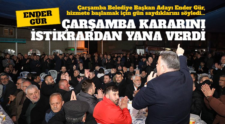 Cumhur İttifakı AK Parti Çarşamba Belediye Başkan Adayı Ender Gür, "Vatandaşımızın gözlerinden, mitinglerimizdeki kalabalıktan, sokaktaki teveccühten görüyoruz ki, Çarşambalı hemşehrilerim kararını istikrardan yana çoktan vermiş. Bize de 1 Nisan itibariyle Çarşambamıza hizmet için çok çalışmak düşüyor" dedi