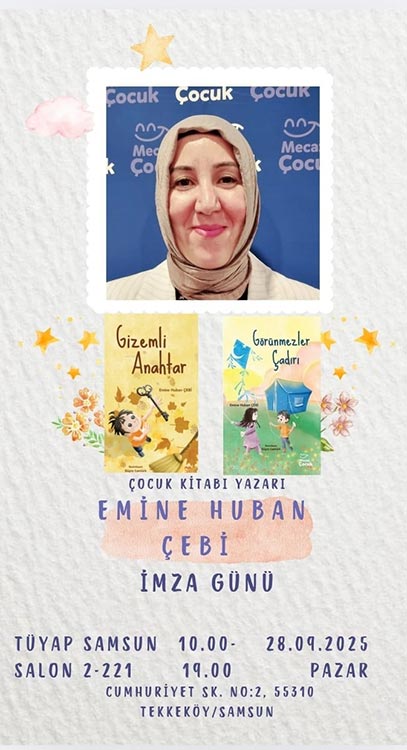 Çocuk edebiyatının sevilen kalemlerinden Emine Huban Çebi, yeni kitabı “Gizemli Anahtar” ve “Görünmezler Çadırı” ile birlikte YÜYAP Samsun Kitap Fuarı'nda okurlarıyla bir araya geliyor.