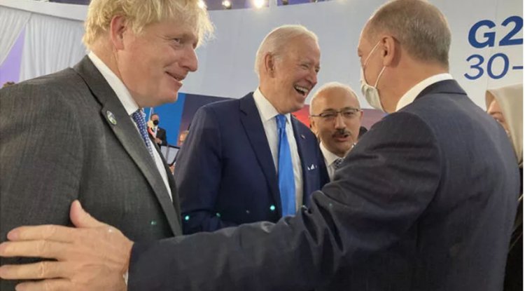 İki liderin konuştuğu anlar dikkat çekti. Bir başka fotoğrafta ise Cumhurbaşkanı Erdoğan, ABD Başkanı Biden ve İngiltere Başbakanı Boris Johnson'ın beraber konuştukları görüldü.