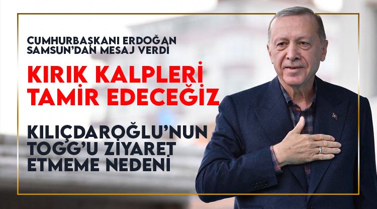 Cumhurbaşkanı Recep Tayyip Erdoğan Samsun'da gerçekleştirilen "Kuruluştan Bugüne Hep Birlikte 2023'e" programında açıklamalarda bulundu. Gündeme dair konuşan Cumhurbaşkanı Erdoğan, CHP lideri Kemal Kılıçdaroğlu'nun TOGG fabrikasını ziyaret etmemesiyle ilgili yaşanan süreci de anlattı.