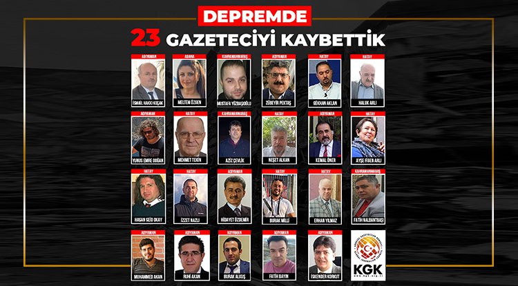 Kahramanmaraş Pazarcık ve Elbistan’da 6 Şubat 2023 günü 9 saat arayla meydana gelen 7.7 ve 7.6 şiddetindeki depremlerde yaşamını yitiren gazetecilerin sayısı 23’e ulaştı.