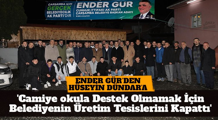 AK Parti Çarşamba Belediye Başkan Adayı Ender Gür, AK Parti'den ayrılma bağımsız aday Hüseyin Dündar'ın başkanlık döneminde Beton Santrali, Asfalt Üretim Tesisi, Asfalt Plenti Tesisi ve Parke Taşı Üretim Tesisi'ni kapattığını hatırlatarak, "Halka hizmet değil kar amacı güttüğü için, camiye, hastaneye, vatandaşa destek olmamak adına bu tesisleri kapattı" dedi