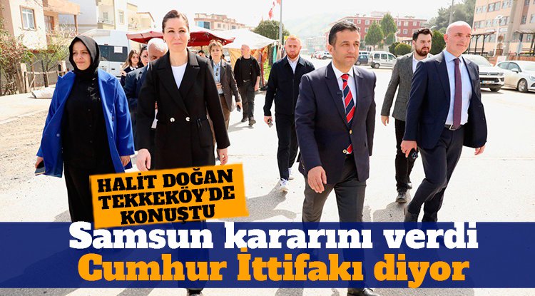 Tekkeköy programında konuşan Cumhur İttifakı AK Parti Samsun Büyükşehir Belediye Başkan Adayı Halit Doğan, “Tarihin doğduğu yerde, Tekkeköy'ümüzde; Genel Başkan Yardımcımız ve Milletvekilimiz Sn. Çiğdem Karaaslan ve Tekkeköy Belediye Başkan Adayımız Mustafa Candal ile birlikte; esnaflarımızı ziyaret ederek hemşehrilerimizle buluştuk. Yerel seçimlere günler kalmışken, 31 Mart sonrası hayata geçireceğimiz projelerimizi anlatıyor, hemşehrilerimizin fikirlerini dinliyoruz. Biz 17 ilçemizin tamamında bir ahenk içerisinde hemşehrilerimize hizmet etmek için yola çıktık.