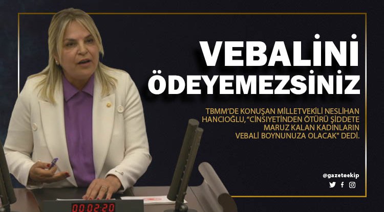 CHP Parti Meclisi Üyesi ve Samsun Milletvekili Neslihan Hancıoğlu, kadına yönelik şiddet ve sağlıkta şiddeti önleyeceği iddiasıyla hazırlanan kanun teklifiyle ilgili mecliste yaptığı konuşmada, "Kasten yaralama suçunun kadına karşı işlenmesi durumunda cezanın alt sınırı altı aydan az olamayacak. Cinsiyetinden ötürü şiddete maruz kalan kadınların vebali boynunuza olacak" dedi.