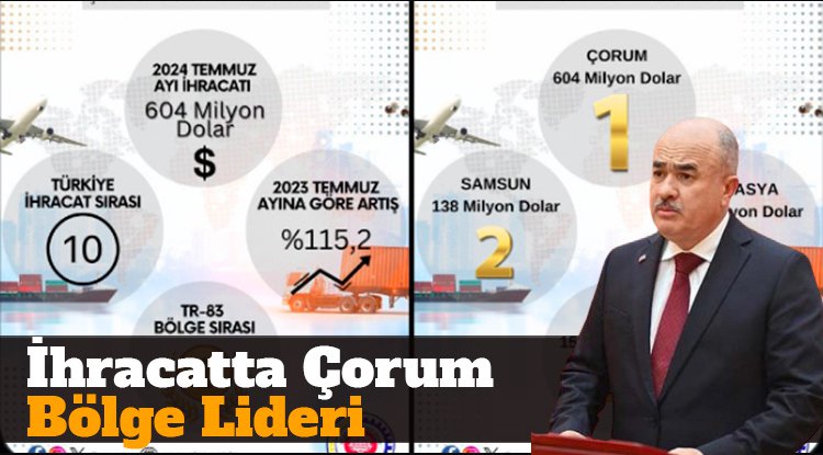Ticaret Bakanlığı'nın verilerine göre Çorum, Temmuz ayında İstanbul'dan sonra ihracatını artıran 'ikinci il' olurken, TR 83 Bölgesi'nde zirvede yer aldı. Vali Doç. Dr. Zülkif Dağlı, "İhracat hedef çıtamız sürekli artacak" dedi.