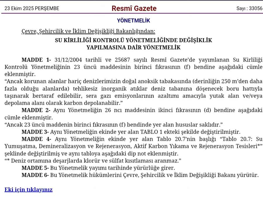 23 Ekim 2025 tarihli Resmi Gazete’de yayımlanan ‘Su Kirliliği Kontrolü Yönetmeliği’nde Değişiklik Yapılmasına Dair Yönetmelik’, 250 metreden derin deniz alanlarında ‘tehlikesiz inorganik atıkların’ deniz tabanına boru hattı ile taşınmasına izin vermektedir.