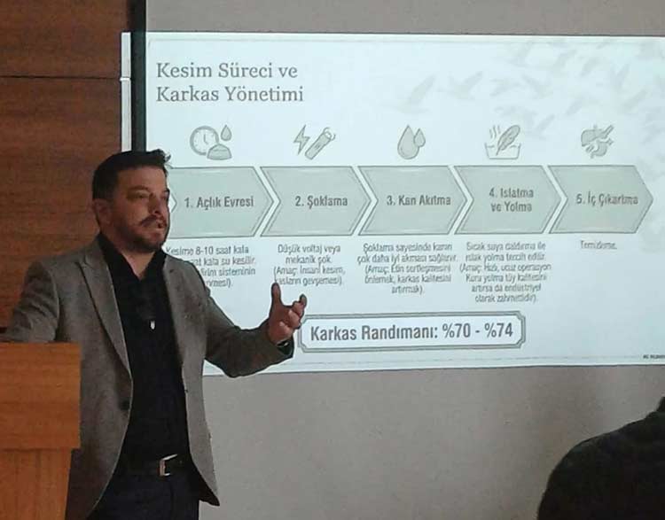 Konferansta konuşan Kooperatif Başkanı Burak Şahinkaya, Türkiye’de her yıl binlerce kazın kesildiğini ancak bu üretim sürecinde özellikle kaz tüyü ve çeşitli sakatatların değerlendirilmeden atıldığını belirterek, bu durumun milli servet açısından ciddi bir kayıp olduğunu ve katma değeri yüksek yan ürünlerin ekonomiye kazandırılması gerektiğine dikkat çekti.