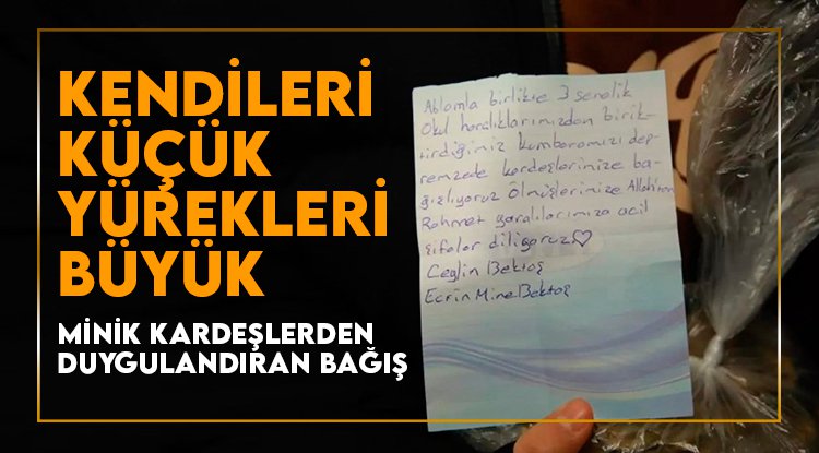 Ceylin Miray Bektaş anlamlı yardımlarına bir de şu notu eklediler: "Ablamla birlikte 3 senelik okul harçlıklarımızdan biriktirdiğimiz kumbaramızı depremzede kardeşlerimize bağışlıyoruz. Ölmüşlerimize Allah'tan rahmet yaralananlara acil şifalar diliyoruz."