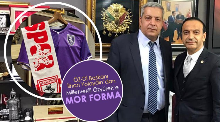 ÖZ-Dİ Güvenlik Eğitim Kurumları Yönetim Kurulu Başkanı İlhan Yolaydın, TBMM'de ziyaret ettiği MHP Sivas Milletvekili Ahmet Özyürek'e Yılport Samsunspor'un "Kadına Şiddete Hayır" temalı mor formasını ve atkısını hediye etti.