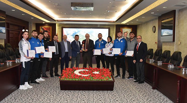Başarıları dolayısıyla öğrenci sporcuları tebrik eden Rektör Prof. Dr. Yavuz Ünal, “Gerçekten gurur duyduk. Sizin başarınız bizim başarımız, umarım bu başarılarınız yükselerek devam eder. Her şeyden önce başarı hikâyenizle diğer öğrencilere örnek olmanız bizler için daha da önemli. Sizin başarınız birçok insanı ben de yapabilirim diye güdüleyecektir, bu kampüs kültüründe önemli bir şey. Sporcu olarak kendinizi kontrol edebiliyorsanız sporcusunuzdur. Her şartta kendinizi kontrol etmeniz gerekir. Beden eğitilse bile ruh eğitilmediği zaman düşünce kontrolsüzlüğü ve öfke kontrolsüzlüğü olur bu durum da spor hayatınıza olumsuz etki yapacaktır. Bir sporcunun başarılı olabilmesi için bu ikisi de olmalıdır” ifadelerini kullandı.