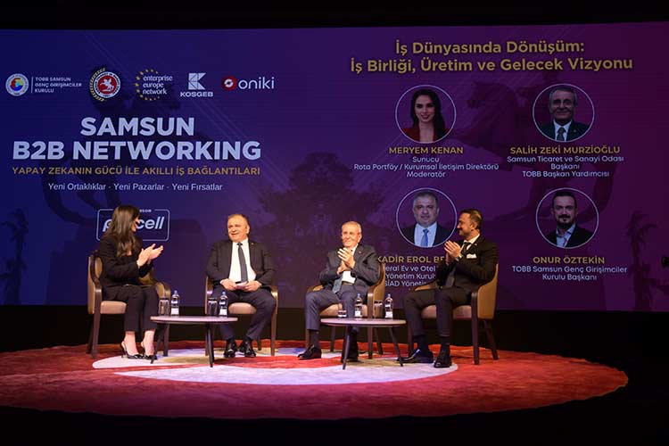 Girişimcilerin, yöneticilerin, yatırımcıların ve profesyonellerin tek çatı altında buluştuğu Karadeniz Bölgesi’nin şimdiye kadar yapılmış en kapsamlı ve katılımlı programında binlerce yapay zekâ destekli eşleşmeler ile bilgi paylaşıldı, iş birlikleri kuruldu ve yeni kapılar aralandı. Toplantının açılış konuşmalarının ardından CNBC-e / Sunucu Rota Portföy / Kurumsal İletişim Direktörü Meryem Kenan moderatörlüğünde düzenlenen, “İş Dünyasında Dönüşüm: İş birliği, Üretim ve Gelecek Vizyonu” başlıklı oturumda Samsun TSO Yönetim Kurulu Başkanı ve Türkiye Odalar ve Borsalar Birliği (TOBB) Başkan Yardımcısı Salih Zeki Murzioğlu, sektörünün başarılı isimlerinden Seral Ev ve Otel Tekstil A.Ş. Yönetim Kurulu Başkanı, Samsun TSO Yönetim Kurulu Başkan Yardımcısı ve TETSİAD Yönetim Kurulu Başkan Yardımcısı Kadir Erol Beytekin ile TOBB Samsun Genç Girişimciler Kurulu Başkanı Onur Öztekin, iş dünyasının dönüşüm sürecine dair önemli değerlendirmelerde bulundu. Salih Zeki Murzioğlu, Kadir Erol Beytekin ve Onur Öztekin; değişen ekonomik dinamikler, dijitalleşmenin etkileri ve sürdürülebilir büyüme stratejileri ve genç girişimciler üzerine görüşlerini paylaşarak, iş birliğinin ve yenilikçi üretim anlayışının gelecekteki rolüne dikkati çekti. Konuşmacılar, özellikle yapay zekâ destekli çözümlerin iş dünyasında rekabet avantajı sağladığını vurgularken, kurumlar arası iş birliklerinin güçlendirilmesinin bölgesel kalkınma açısından kritik öneme sahip olduğunun altını çizdi. Ayrıca genç girişimcilerin desteklenmesi, yerel üretimin küresel pazarlara açılması ve inovasyon kültürünün yaygınlaştırılması konuları da oturumun öne çıkan başlıkları arasında yer aldı.