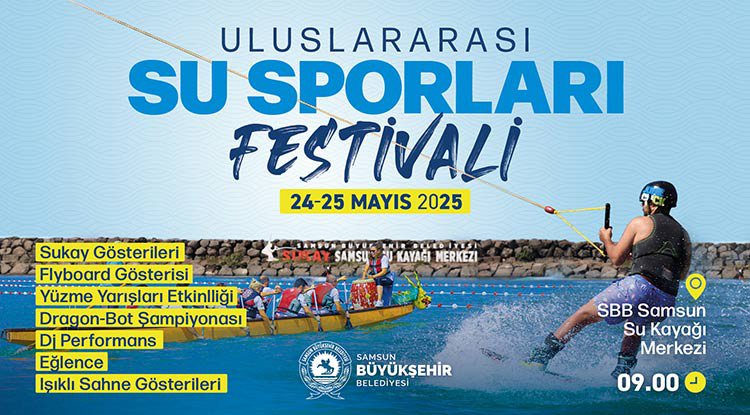 Samsun Büyükşehir Belediyesi ev sahipliğinde düzenlenen Uluslararası Su Sporları Festivali su sporları tutkunlarını Samsun’da buluşturuyor. Samsun’da ilk kez düzenlenecek festival 24 Mayıs Cumartesi günü Samsun Büyükşehir Belediyesi SUKAY Tesisleri’nde 09.00’da başlayacak. İki gün sürecek festival Samsun’un su sporu noktasındaki zenginliğini yansıtacak, su sporlarına gönül verenleri buluşturacak.