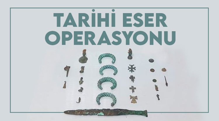 Yapılan aramada; 4 adet heykel, 4 adet hac sembollü obje, 2 adet sikke, 2 adet ok ucu, 1 adet madalyon, 10 adet çeşitli obje, 1 adet kama ele geçirildi. Yakalanan iki kişi gözaltına alındı.