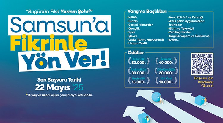 ‘Bugünün Fikri Yarının Şehri’ mottosu ile düzenlenen “Samsun’a Fikrinle Yön Ver” yarışması için kültür, turizm, gençlik, spor, sosyal hizmetler, çevre, ulaşım, trafik, akıllı şehir uygulamaları, istihdam, gıda-tarım-hayvancılık, bilim, sağlık, kent kültürü, kent estetiği gibi ana başlıklar belirlendi. Son başvuru tarihi 22 Mayıs olan yarışmada birinci olana 50 bin TL, ikinciye 40 bin TL, üçüncüye 30 bin TL, dördüncüye 20 bin TL, beşinciye 15 bin TL ödül verilecek. Yarışmanın jüri özel ödülü ise 10 bin TL olarak belirlendi. 14 yaş ve üzeri kişilerin katılımına açık olan yarışmada, başvurular bireysel olarak yapılacak. Bir katılımcı en fazla 3 farklı proje başvurusunda bulunabilecek. Yarışma için başvurular Samsun Büyükşehir Belediyesi’nin resmi internet sitesinden samsunafikrinleyonver.samsun.bel.tr linki üzerinden yapılabilecek.