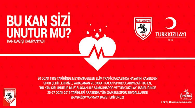 Türk Kızılay'nın ülkede kan ve kan ürünleri ihtiyacını karşılamak üzere yürüttüğü ‘Ulusal Güvenli Kan Temini Programı’ kapsamında Samsunspor’un 20 Ocak 1989 tarihinde Havza ilçesinde meydana gelen elim trafik kazasında hayatını kaybeden futbol adamlarına, yaralanan ve sakat kalan sporculara ithafen Samsunspor ve Türk Kızılay işbirliğinde “Bu Kan Sizi Unutur mu?” sloganı ile kampanya başlatılıyor.