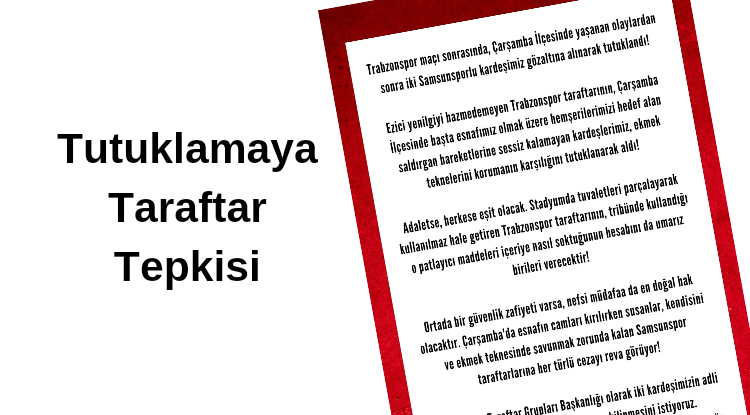 Samsunspor Taraftar Dernekleri Başkanları yaptıkları açıklamada, "Trabzonspor maçı sonrasında, Çarşamba İlçesinde yaşanan olaylardan sonra iki Samsunsporlu kardeşimiz gözaltına alınarak tutuklandı! Ezici yenilgiyi hazmedemeyen Trabzonspor taraftarının, Çarşamba İlçesinde başta esnafımız olmak üzere hemşerilerimizi hedef alan saldırgan hareketlerine sessiz kalamayan kardeşlerimiz, ekmek teknelerini korumanın karşılığını tutuklanarak aldı! Adaletse, herkese eşit olacak. Stadyumda tuvaletleri parçalayarak kullanılmaz hale getiren Trabzonspor taraftarının, tribünde kullandığı o patlayıcı maddeleri içeriye nasıl soktuğunun hesabını da umarız birileri verecektir! Ortada bir güvenlik zafiyeti varsa, nefsi müdafaa da en doğal hak olacaktır. Çarşamba'da esnafın camları kırılırken susanlar, kendisini ve ekmek teknesinde savunmak zorunda kalan Samsunspor taraftarlarına her türlü cezayı reva görüyor! Samsunspor Taraftar Grupları Başkanlığı olarak iki kardeşimizin adli süreçlerinin takipçisi olacağımızın bilinmesini istiyoruz. Kardeşlerimize gözaltı ve tutuklamayı layık görenlerin, gözü dönmüş Trabzonspor taraftarını görmezden geldiğini düşünmek istemiyoruz! Kimse unutmasın; Hiç bir Samsunspor taraftarı yalnız değildir" dedi.