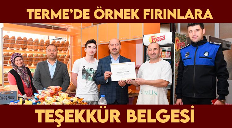 Zabıta Müdürlüğü'nün yaptığı denetimler sonucu tarifede belirlenen gramaj değerlerine gösterilen önem ve hijyen şartlarının uygunluğu ile tüketiciye güvenilir gıda ulaştırmada gayretli çalışarak farkındalık oluşturan fırınlara Terme Belediye Başkanı Ali Kılıç tarafından 'Teşekkür Belgesi' verildi.