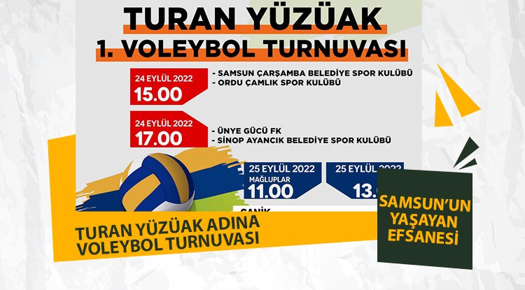 Samsun voleybolunun yaşayan efsanesi Turan Yüzüak adına Kadınlar İkinci Ligi takımlarının katılacağı voleybol turnuvası düzenlenecek. Samsun Atatürk Spor Salonu’nda 24-25 Eylül tarihleri arasında organize edilecek turnuvaya Çarşamba Gençlikspor, Ordu Çamlıkspor, Sinop Ayancık Belediyespor, Ünye Gücü takımları katılacak.