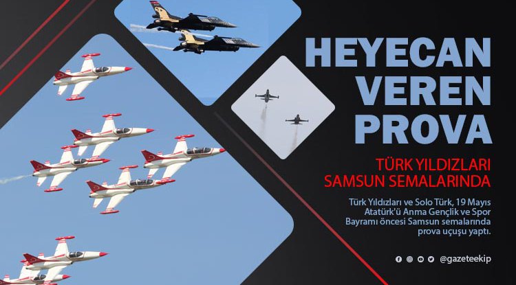 Samsun'da 19 Mayıs Perşembe günü yapılacak gösteri öncesi Samsun’a gelen Türk Yıldızları ve Solo Türk pilotları uçaklarıyla birlikte Samsun semalarında prova uçuşu gerçekleştirdi.