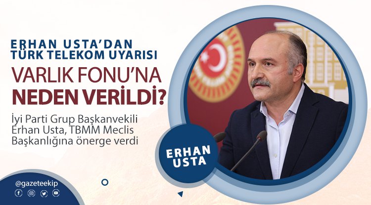 İYİ Parti Grup Başkanvekili ve Samsun Milletvekili Erhan Usta, 2026 yılı başında bedelsiz olarak Hazineye devredilecek olan Türk Telekom hisselerinin 1 milyar 650 milyon dolara Türkiye Varlık Fonu (TVF) tarafından satın alınmak istendiğini söyleyerek TBMM Meclis Başkanlığına önerge verdi.