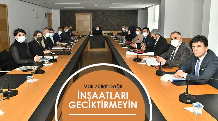 İlçelerimizde inşaatı devam eden yeni hükümet konakları ve okul inşaatlarının son durumunun görüşüldüğü toplantıda Vali Dağlı, inşaatların herhangi bir gecikme olmaksızın bitirilmesi için çalışmaların hassasiyetle sürdürülmesini istedi.