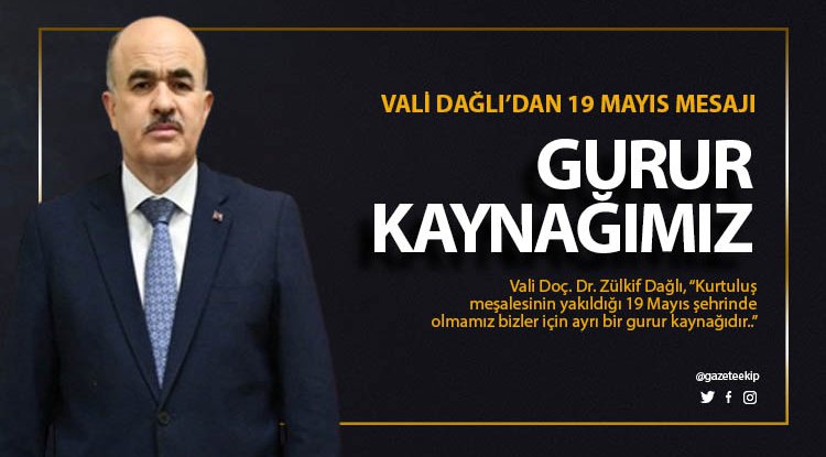 Samsun Valisi Doç. Dr. Zülkif Dağlı, ‘19 Mayıs Atatürk’ü Anma, Gençlik ve Spor Bayramı nedeniyle bir kutlama mesajı yayımladı. Vali Dağlı mesajında, "Kurtuluş meşalesinin yakıldığı 19 Mayıs şehrinde olmamız bizler için ayrı bir gurur kaynağıdır" dedi.