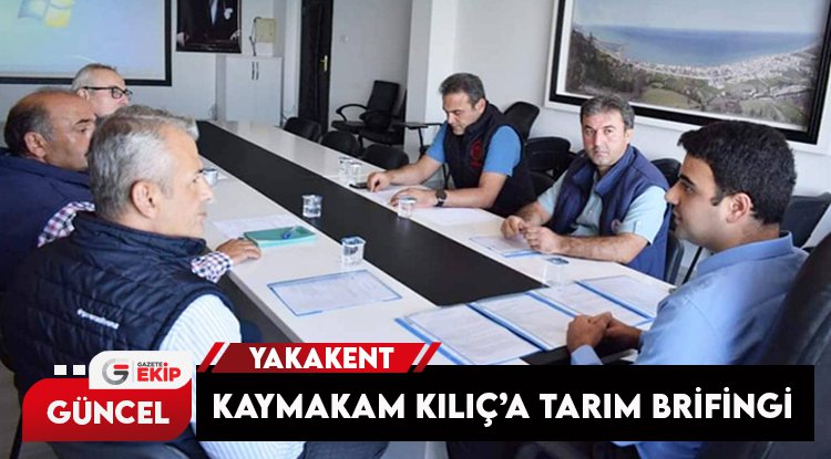 Yakakent'teki İlçe Tarım ve Orman Müdürü Osman Akman ile İlçe Tarım ve Orman Müdürlüğü uzmanları, Kaymakam Abdüssamed Kılıç'a 2021-2022 yılı çalışmalarının yanısıra gıda, tarım, hayvancılık ve TAPDK ile ilgili çalışmalar hakkında birifing verildi.